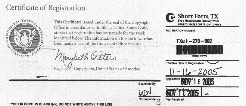 Behold: A Certificate of Registration from the Copyright Office of the United States, effective November 16, 2005.