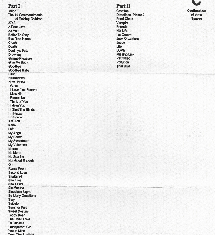 I was roughly 21 years old when I decided that I needed to copyright a volume of my poetic work. I am laughing at the listing of poems included in Part I and Part II of this masterpiece. I must have been drunk.